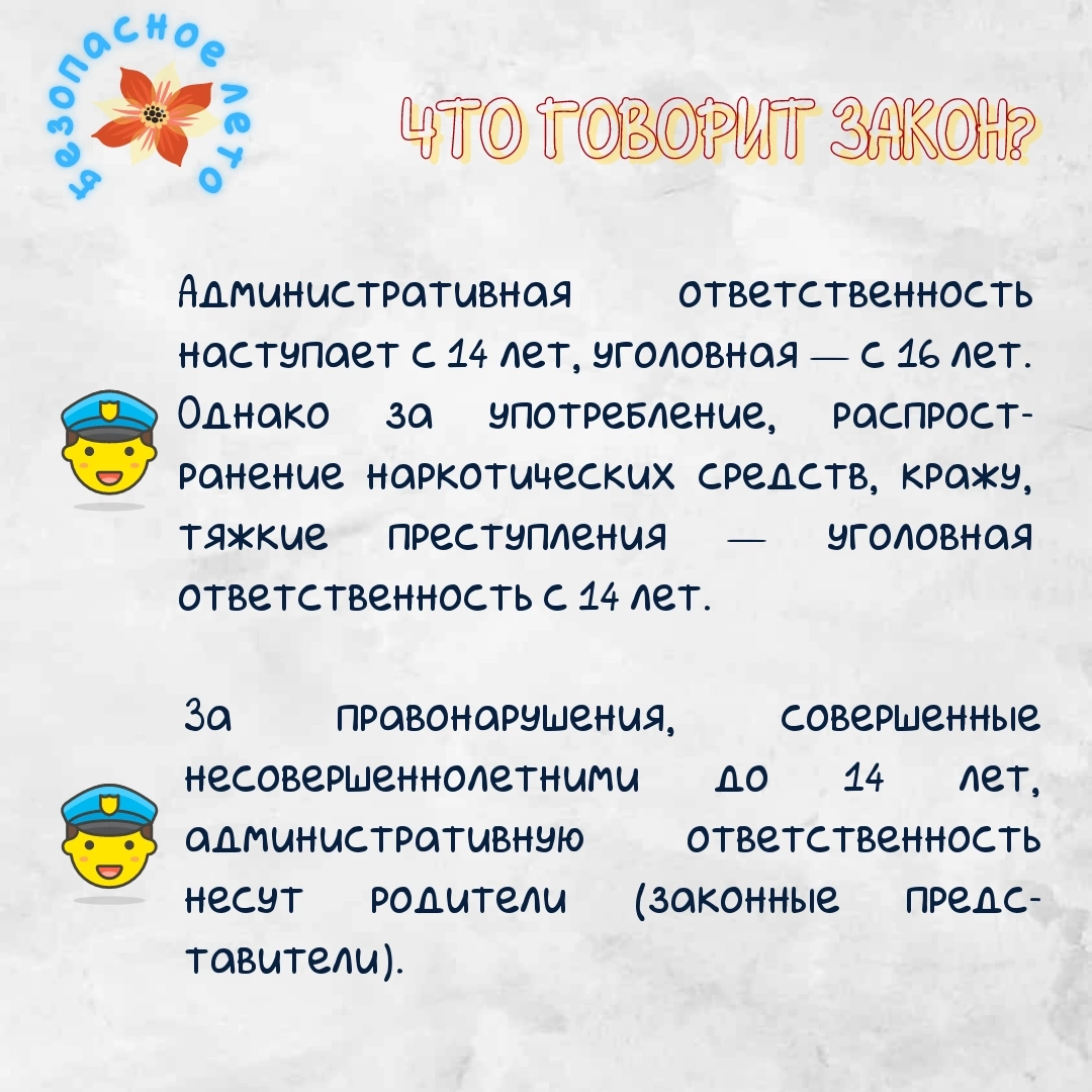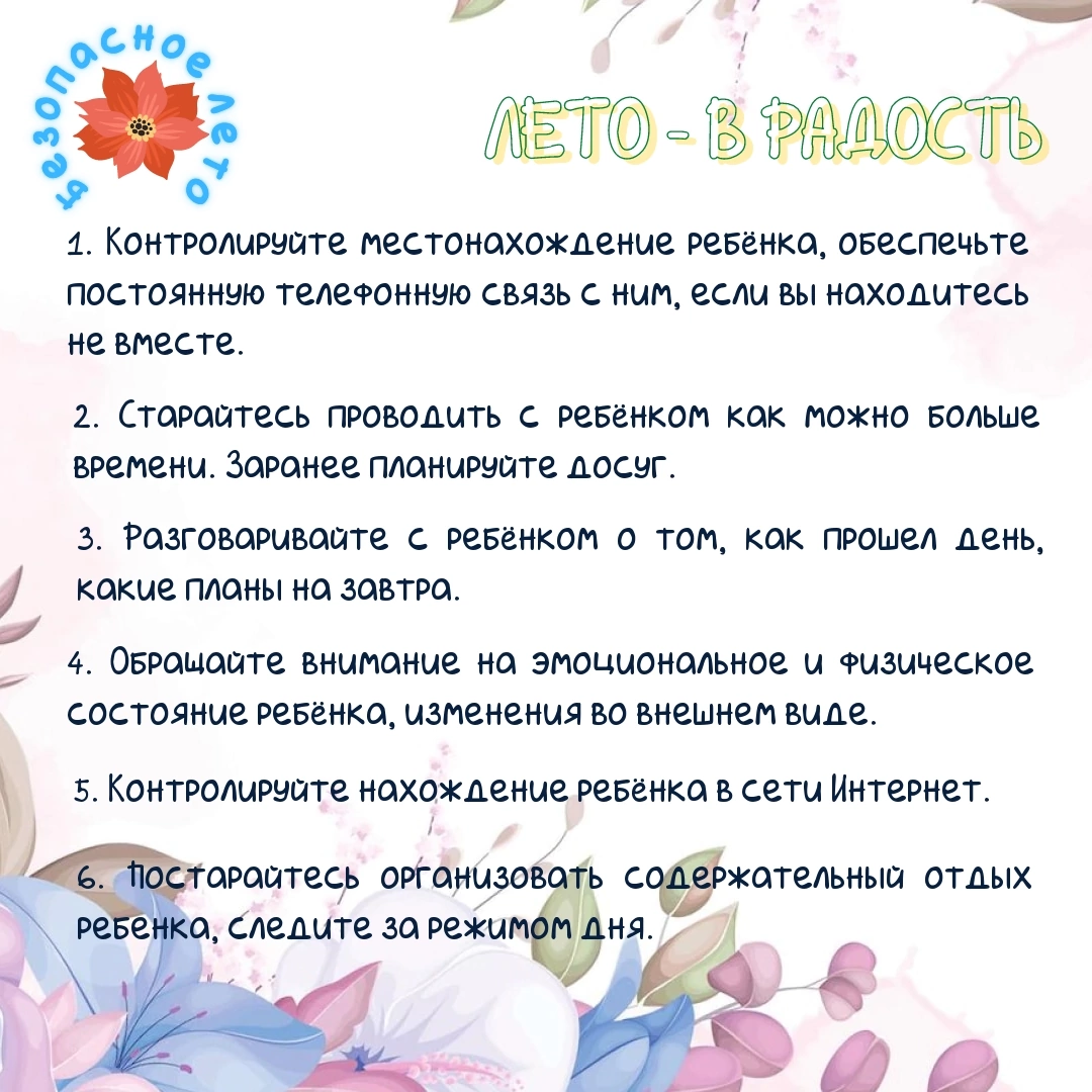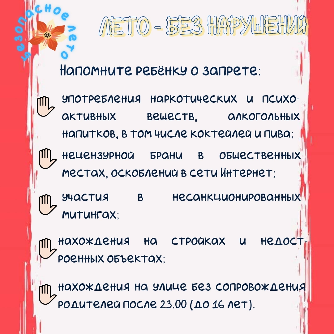 На каникулах у Ваших детей увеличивается количество свободного времени, которое они часто проводят без должного контроля со стороны взрослых, что может привести к угрозе жизни и здоровью детей, совершению правонарушений.