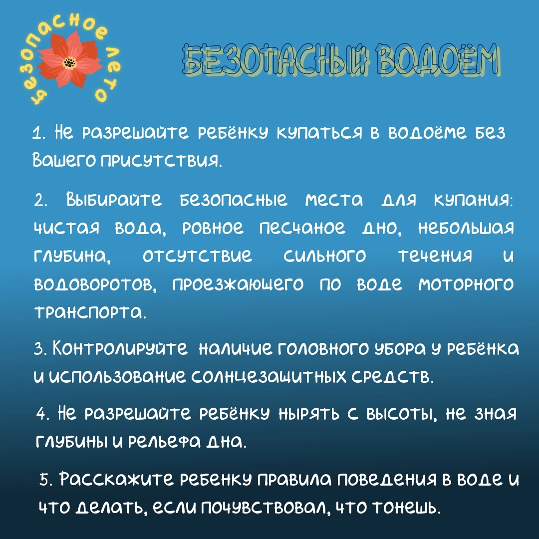 · об опасности нахождения вблизи водоемов, особенно не приспособленных для купания, т.к. существует большая вероятность утопления;